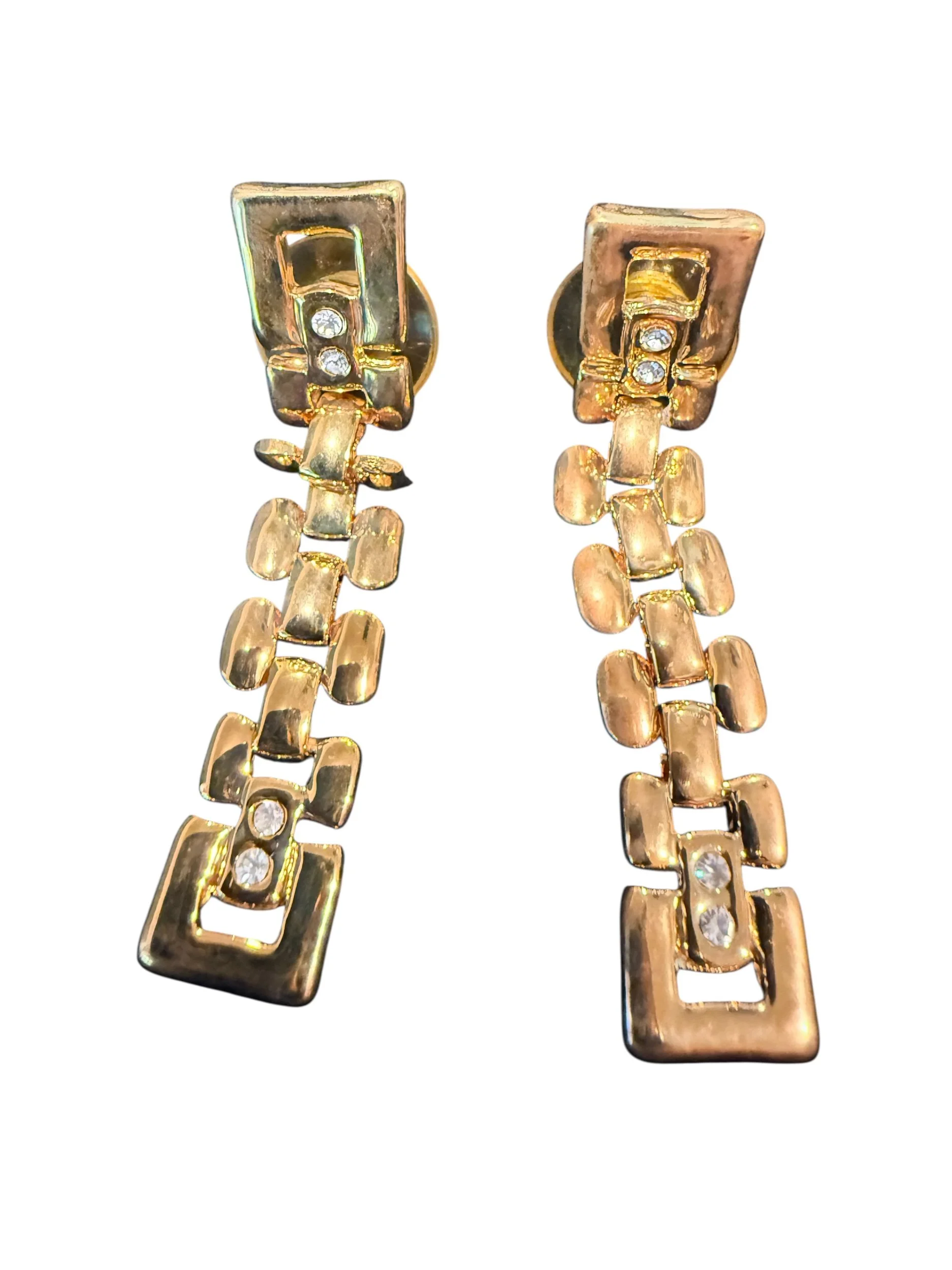 Make a bold yet elegant statement with our Gold Digger Earrings. These striking drop earrings feature a modern geometric design with sculpted gold-toned links that cascade beautifully for a fluid, eye-catching look. Subtle crystal accents add just the right touch of sparkle, catching the light with every movement.